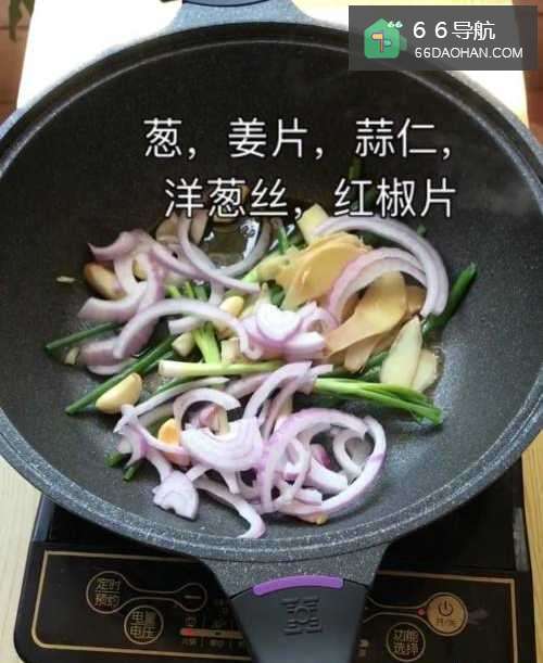 2下入葱,姜片,蒜片,洋葱丝,红椒片,中小火煸炒出香味,