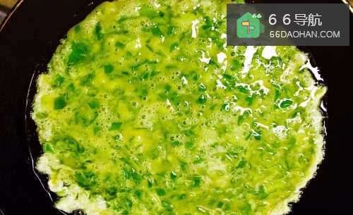 4接下来,在平底锅烧热之后加入少许油,油热了之后,慢慢的将青椒鸡蛋液倒进去,转小火,慢慢的煎,火太大的话鸡蛋焦了青椒还没熟。