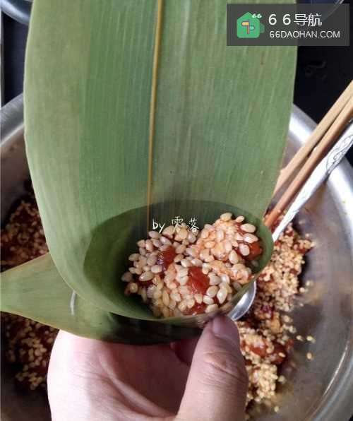 清香的粽叶一层层剥开,红黄闪亮的色泽,泛着油润的光泽。