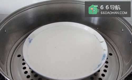 6取一个大一点的盘子,盘里均匀的抹上油后倒入粉糊冷水上锅大火蒸25至30分钟后取出待凉。