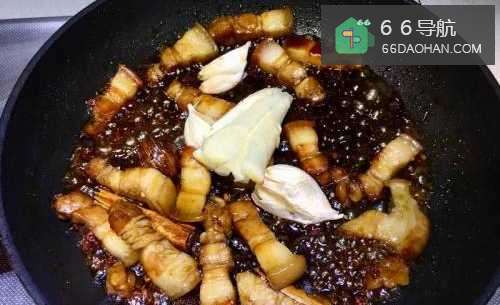 2热锅放入砂糖炒至融化后,先放入五花肉煸香过再放入香料类离袭炒过