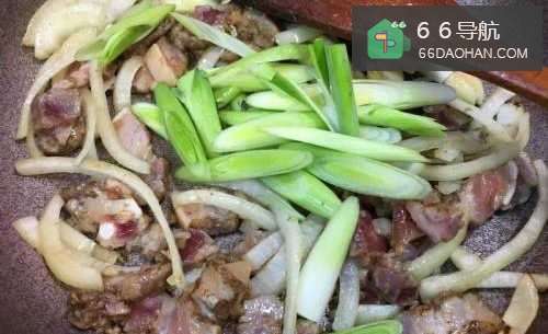 3待洋葱香气释出后加入咸猪肉翻炒。