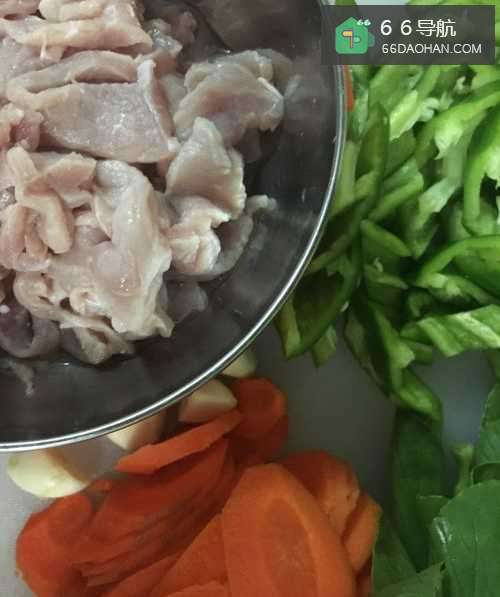 准备好食材,瘦肉切丝,胡萝卜切片,青椒切块,准备好葱蒜姜备用。