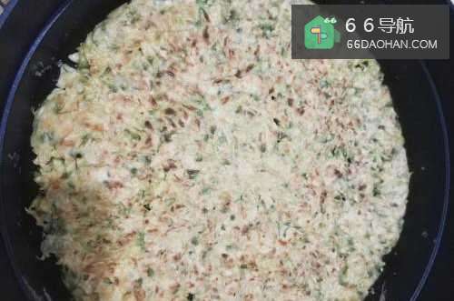 3然后平底锅小火加热,刷一层油,倒入槐花糊糊,用铲子小心地把糊糊摊开成饼状,不要太厚哦,最好不要超过1厘米厚,否则不容易熟透。
