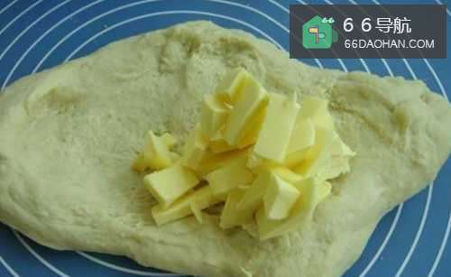 1.高筋面粉、糖、盐、酵母、牛奶鸡蛋混合在一起用力揉成面团,揉到抻开面团稍微薄一点就会被扯出很多裂洞后加入黄油