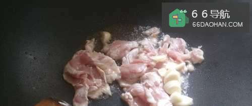 5第五步等油热得翻滚的时候把猪肉放入煸炒(一定要等油热否则猪肉的质感和口感控制不了),加入少许大蒜和生抽盐之类的调味品,煸炒到发黄就可以把菜心放进去了。