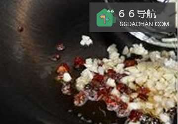 把大蒜、红辣椒切碎,放入香麻油的锅中,加少许白砂糖,爆出香味。