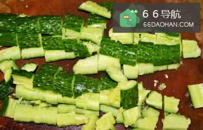 3切块。拍好的黄瓜就可以切成3至4厘米长的小块。