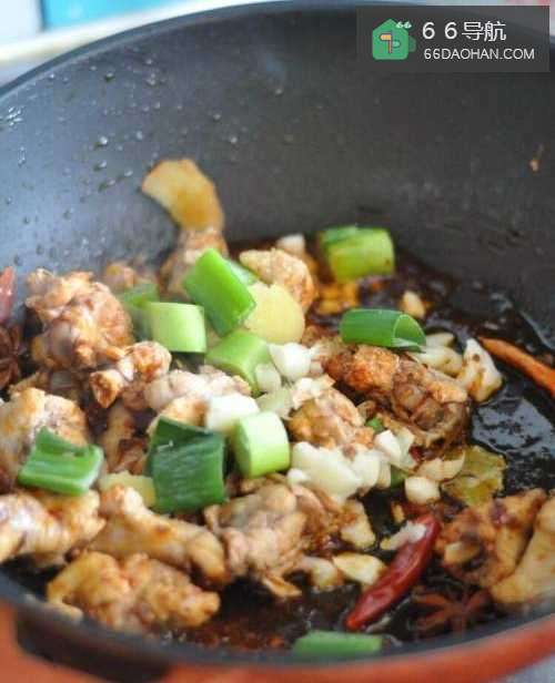 5放入鸡翅根翻炒,同时放入葱、姜、蒜。