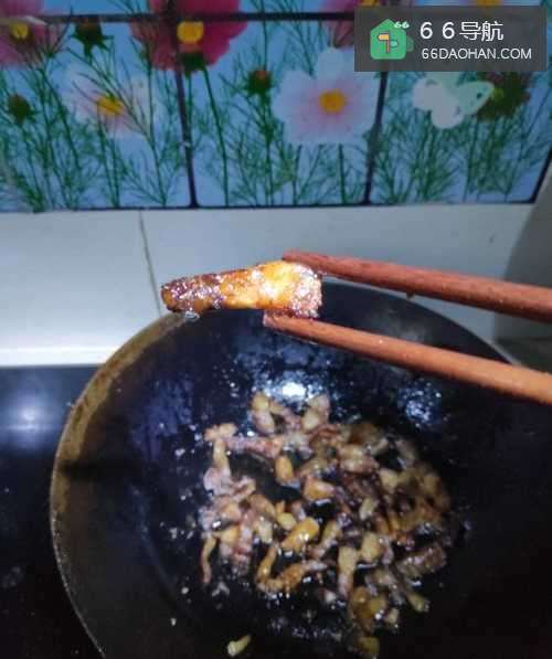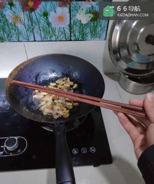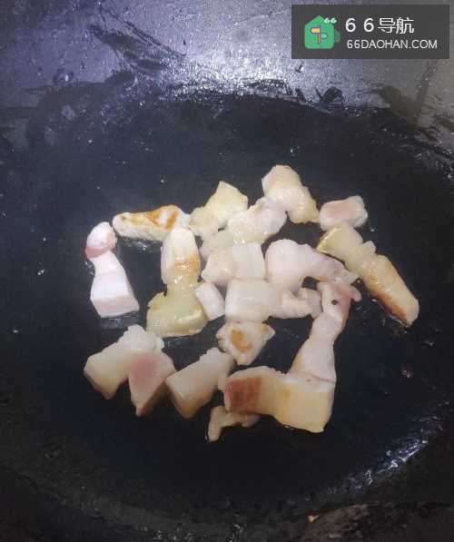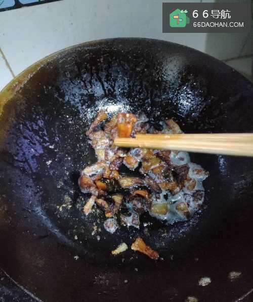 3让肥肉在锅底煎出一些油,然后用筷子给肥肉翻面。