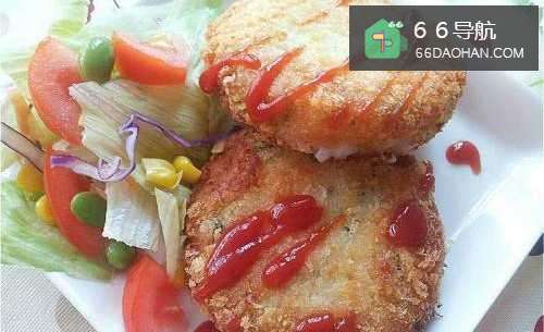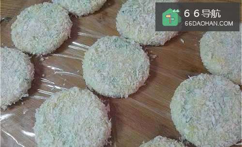 4把成型的饼先沾上一层薄面粉,再继续沾蛋液和面包粉。