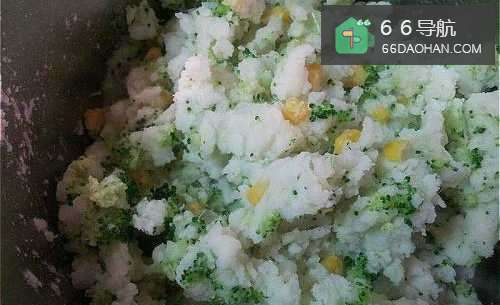 2加入玉米粒拌匀,加入已汆烫好切碎的西兰花,所有材料拌匀。