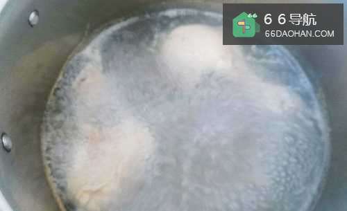 4将鸡腿冷水入锅,水开后瓢走浮沫,在锅里煮制12分钟。