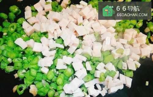 5豆角爆炒熟后下入肉糕粒翻炒。