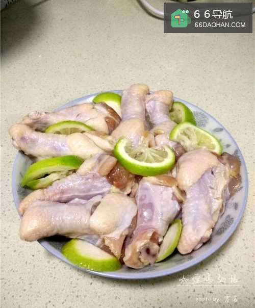 3青柠檬洗净,往鸡翅根碗里挤出柠檬汁,然后切片,同鸡翅根拌在一起,腌制10分钟;