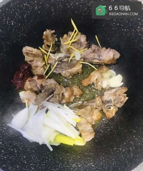 6排骨炒至金黄后,下入豆瓣酱与葱、姜、蒜,翻炒出香味。