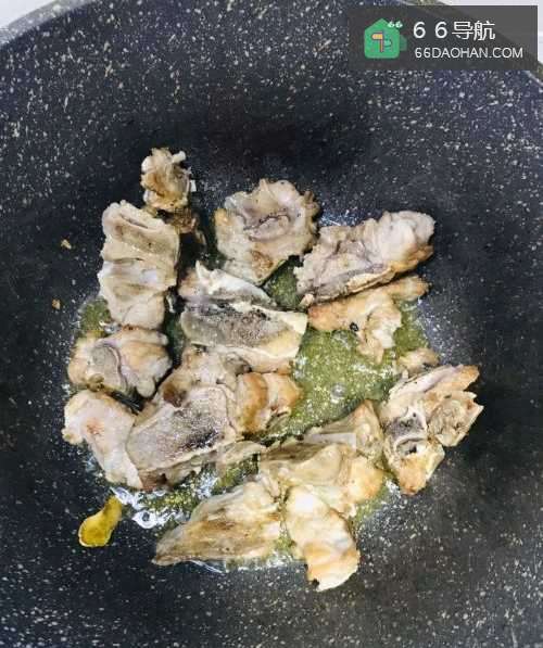 5重新起锅下油,油好后下入排骨翻炒,炒至金黄。