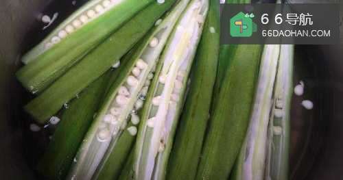 3锅热水加入少许盐,煮开后放入秋葵汆烫十秒捞出。