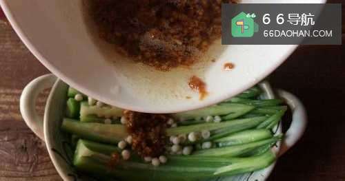 4把汆烫好的秋葵放置盘中,倒入蒜蓉生抽酱淋在表面即可。