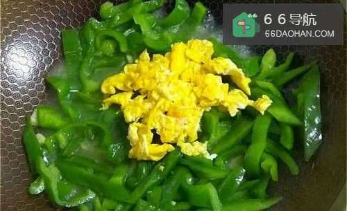 5倒入青椒拌炒,加盖焖2~3分钟,将蛋碎倒入拌炒均匀约1分钟,并以盐和味精调味即可。