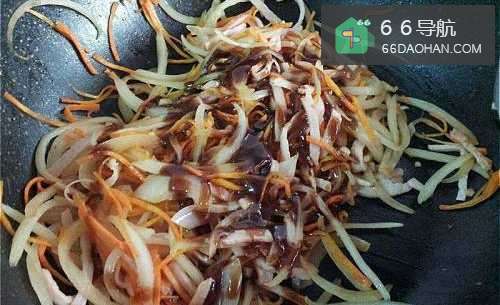 4把炒好的火腿丝加入,然后加入日式酱料拌炒一下。