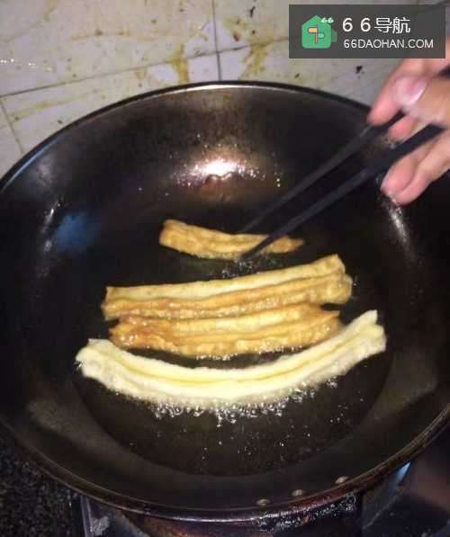 5油锅烧到七成热,下油条坯子炸制,边炸边给它翻身。