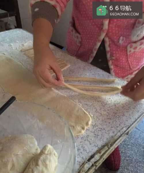 4案板上抹油,手上也要抹油,将面团在案板上按压成长方形,刀上也抹油,将大面片切成小条,两根面条叠在一起,压扁,用筷子在中间压道沟出来。
