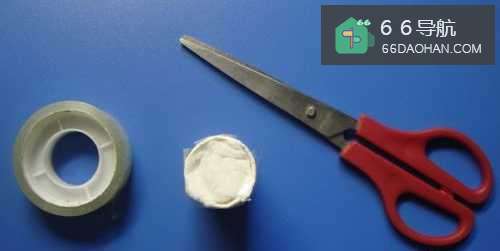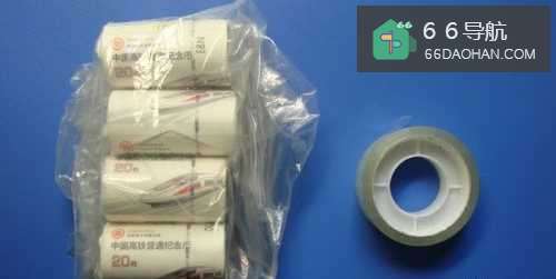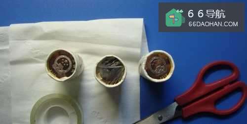 4 然后,把吸水绵纸放在纪念币的纸筒上,用剪刀剪透明胶把纸筒包起来,这样就可以防潮和避免氧化,如下图所示。