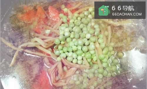 干山药用开水泡软,滤干;胡萝卜切片;豌豆剥壳,洗净;干黄花泡软,滤干备用。