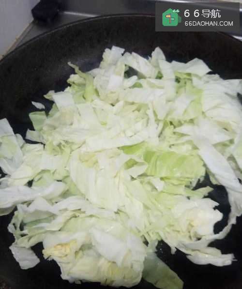 4圆白菜翻炒到稍微变软后放入切好的大葱然后快速翻炒。