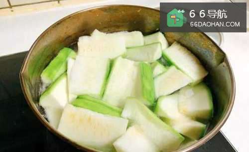 2煮一锅水,待水沸腾后,加入1茶匙盐和丝瓜,煮至丝瓜略为软化即可,然后捞起软化的丝瓜,泡到冰水中