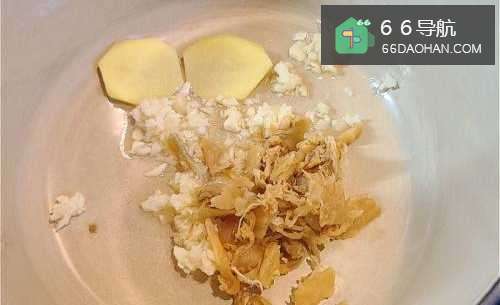 2热锅下油放入姜片、蒜蓉和冬菜炒香。
