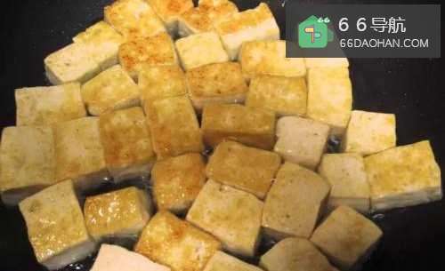 2热油将豆腐煎得两面金黄,盛起备用。