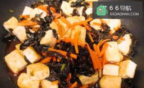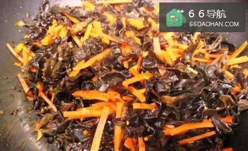 4加入木耳和胡萝卜丝同炒,到胡萝卜软化、木耳爆出响声。
