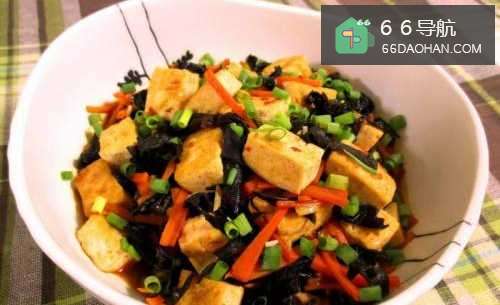 姜蒜切末,胡萝卜和木耳切丝,豆腐切小块。