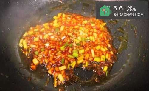 3用剩下的油,炒香姜蒜末、葱白和豆瓣酱。