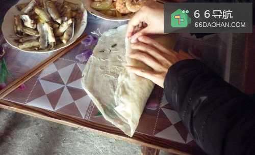 7第一下覆盖住辅料,第二下将右边的面皮折过来,第三下再向前滚一下,用手握住下面的折口即可。