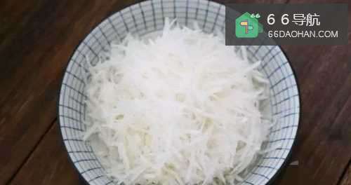 2锅中加入500ml的清水,放入萝卜丝,煮3分钟左右,萝卜丝变软后即可关火,煮过后的萝卜丝可以去除萝卜的辛辣味。