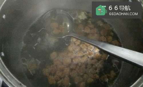 7最后一步,倒入绿豆牛肉丸,加入适量的盐、味精等调料,等待水再次沸腾以后即可出锅了。
