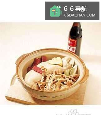 3将整只老鸭放入专用汤煲中,放入火腿片、笋干丝、大葱白、厚姜片,调入黄酒。