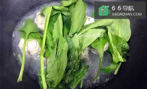 8肉丸煮熟后,放入少许菠菜叶烫熟,关火。
