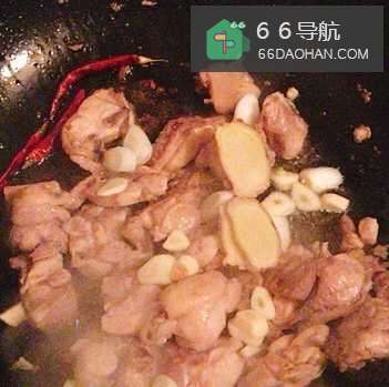 4鸡腿变色后加入葱姜蒜片和干红辣椒炒香