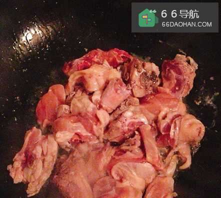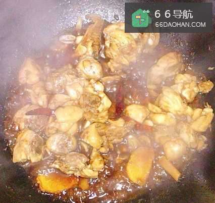 5鸡肉炒至微焦后加入料酒,生抽,老抽和蚝油,翻炒均匀