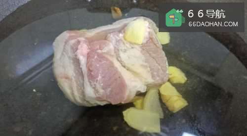 2接下来,在锅中加入冷水,放入五花肉,姜片,料酒煮出血水;