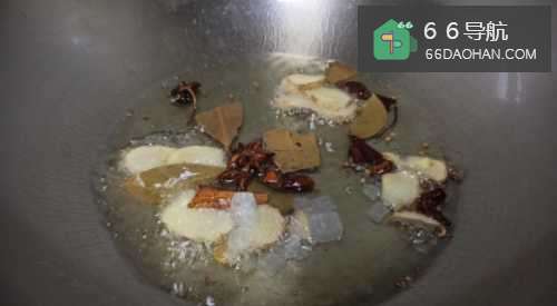 5另外起锅,下大料爆香,转小火下冰糖炒化;