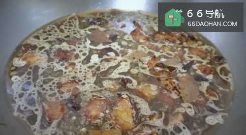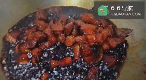 6放入五花肉小火翻炒,放入生抽、老抽翻炒均匀,倒入水大火煮开,然后小火熬制40分钟;