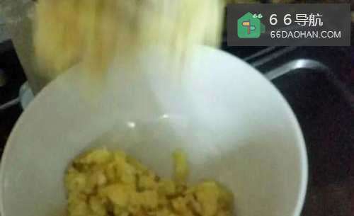 热油热锅后,将打散的鸡蛋倒入漏勺做蛋酥