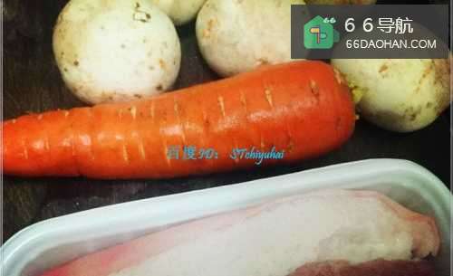 准备主要的食材几个新鲜的蘑菇、一根胡萝卜、一块腿肉,少许生姜、蒜头等。