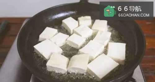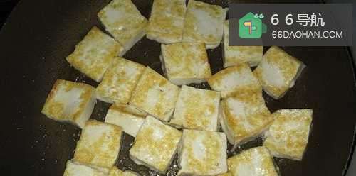 6把豆腐块均匀裹上蛋液,淀粉液,放入油锅煎炸,煎至一面金黄