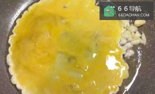 2油锅加热放入蒜末炒香,再将蒜末拨到锅边,倒入蛋液